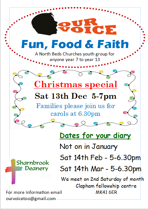 Fellowship lunches are usually held every month on 1st Sunday either in the Fellowship Room, St Owen’s, Bromham, or in someone’s home. All are welcome. Our next lunch is on Sun 4th Jan in the Fellowship Room at St Owen’s Bromham. Bring a plate of food to share and your own drinks. Please do come along!